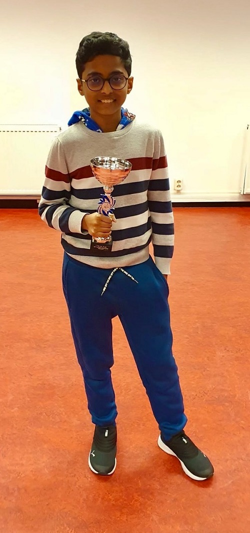 Toernooitijger Sparsh heeft zijn kerstvakantie goed benut, door maar liefst aan twee schaaktoernooien mee te doen. En hoe! Hij viel twee keer in de prijzen. Op 22 december won Sparsh een derde prijs op het Klim-op Jeugdschaaktoernooi. En 5 dagen later, op 27 december, zelfs een eerste prijs, bij het Open Capelle Jeugd Kampioenschap van de Rotterdamse Schaakbond. Goed bezig! Gefeliciteerd Sparsh.