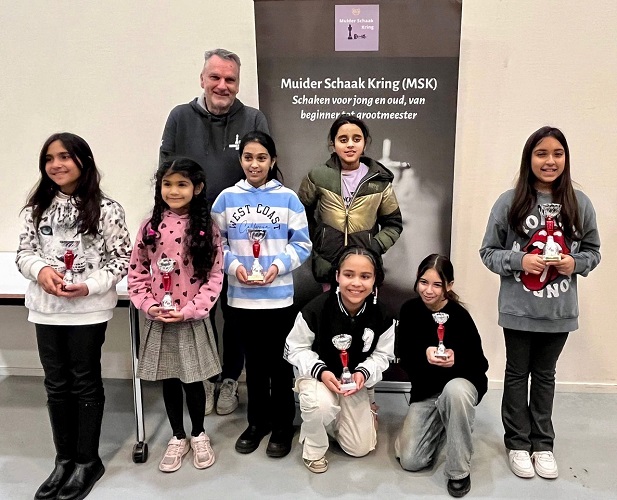 Naast 15 Zukertorters deden er 11 spelers mee die al lang op de wachtlijst staan om lid te worden van Zukertort. Maar er waren ook veel spelers van omliggende clubs. VAS deed het goed met bekers voor Raghav (1e in A) , zus Ira (1e in F), Dani�l (1e in C), en Jan (3e in A). Amsterdam West deed het ook goed met 1e plaatsen voor Sven (B) en Aden (D) en een 2e plaats voor Jo�l (A). Bij de Zukertorters was er een 2e plaats voor Dolev (B) en 3e plaatsen voor Victor (B), Neev (C) en Shanay (D). Van de andere clubs pakten Hans Micha�l van Caissa (1e in G) en Joris van SC Hoofddorp (3e in G) nog een beker. De overige bekers gingen naar clubloze spelers, waarvan maar liefst 5 van de Zukertort wachtlijst: Yihan (1e in E), Diptaw (2e in D), Reyansh (2e in E), Krrish (2e in F) en Kai (3e in F). Aden (D), Yihan (E), Ira (F) en Hans Micha�l (G) wonnen al hun partijen. William van VAS viel net buiten de prijzen in Groep A, maar is toch vermeldenswaard vanwege zijn vele tijdnoodduels, want er werd zonder increment gespeeld! Dat leverde veel spanning op bij hem en de kijkers.