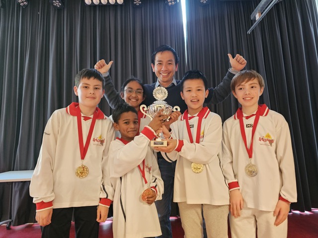 Dan AICS: dit team bestaat uit een groot aantal Zukertorters. Anika, Palash, Aadith en Vivaan. Niet gek dus dat zij zo hoog scoorden en derde werden. Dit team mag zich gaan voorbereiden op het NK! Tot slot de Triangel. Hierin zitten Zukertorters Aadvik en Nivedita (foto gemaakt door de toernooiorganisatie). Kopman is Alex die bij VAS speelt. Bij de voorronde moest de Triangel nog zijn meerdere erkennen in AICS, maar nu waren de rollen omgekeerd, want de Triangel werd regionaal kampioen. Zeer verdiend, want er werd in de finale 6 keer gewonnen en maar 1 keer 2-2 gespeeld tegen de latere nummer 2. Gefeliciteerd met de mooie prestaties! En mooi om zoveel Zukertorters op het erepodium te zien staan. Daar zijn we als club natuurlijk trots op. Op de tweede en vierde plaats eindigden scholen uit Almere en Muiden.