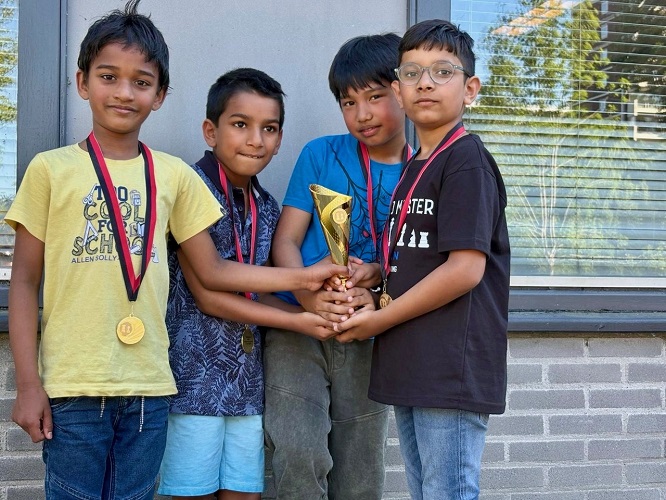 De Zukertort E1 (Aashray, Daksh, Anika, Shanay) is tijdens het teamkampioenschap van afgelopen zondag in Muiderberg derde geworden, en kwalificeerde zich daarmee voor het nationale teamkampioenschap E! De Zukertort E2 (Neev, Troy, Dev en Saanvi) legde beslag op de zevende plaats. De E1 verloor alleen van het sterke team uit Almere, en eindigde precies gelijk met de VAS E1 op de tweede/derde plaats. De barrage voor de tweede plek tussen VAS E1 en Zukertort E1 ging helaas verloren, dus werd het het brons! De dappere strijders staan met elkaar op de foto!
